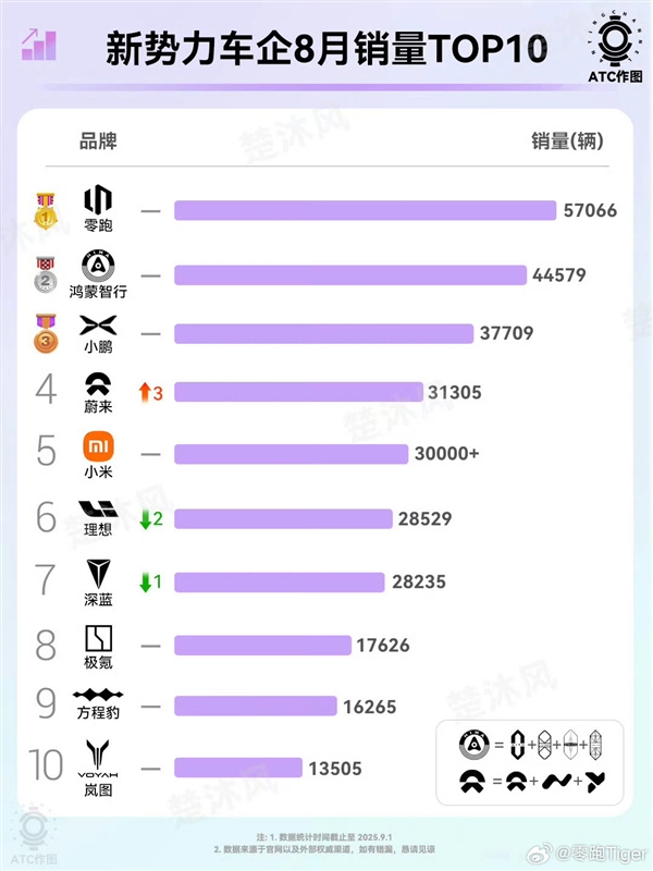 理想、深藍等品牌銷量也都超過了28000輛,但排名有所下滑。極氪、方程豹、嵐圖也紛紛上榜,擠進前十。